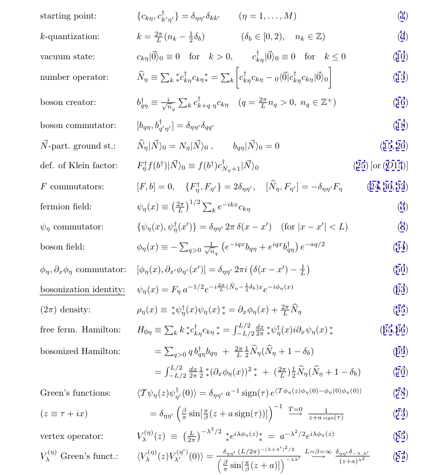\[\begin{aligned} \psi_\eta(x) & =F_\eta \lambda_\eta(x) e^{-i \varphi_\eta^{\dagger}(x)} e^{-i \varphi_\eta(x)} \\ & =F_\eta\left(\frac{2 \pi}{L}\right)^{1 / 2} e^{-i \frac{2 \pi}{L}N_\eta x} e^{-i \varphi_\eta^{\dagger}(x)} e^{-i \varphi_\eta(x)} \quad (\text { Eq.22 } ) \\ & =F_\eta a^{-1 / 2} e^{-i \frac{2 \pi}{L} N_\eta x} e^{-i \phi_\eta(x)} \quad (\text { Eq.13 } ) \\ \end{aligned} \tag{26}\]最终,我们得到了 bosonic identity :