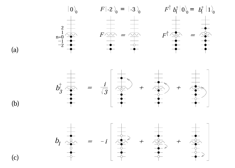 \[\begin{aligned} \psi_\eta(x) & \equiv\left(\frac{2 \pi}{L}\right)^{1 / 2} \sum_{k=-\infty}^{\infty} e^{-i k x} c_{k \eta} \\ c_{k \eta} & =(2 \pi L)^{-1 / 2} \int_{-L / 2}^{L / 2} d x e^{i k x} \psi_\eta(x) \end{aligned} \tag{1}\]| 现在定义Fock态。定义的“真空态”是费米海。之后的$ | 0\rangle$指的都是$ | G.S.\rangle$。 |