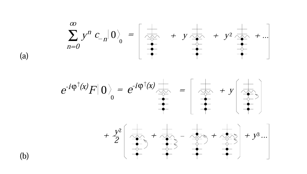 \[\begin{aligned} \sum_{n=0}^{\infty} A_n y^n & c_{-n}|0\rangle_0=1-y\left(c_0^{\dagger} c_{-1}\right)+y^2\left[-\frac{1}{2}\left(c_0^{\dagger} c_{-2}\right)+\frac{1}{2}\left(c_{-1}^{\dagger} c_{-2}\right)\left(c_0^{\dagger} c_{-1}\right)\right] \\ \quad+ & y^3\left[-\frac{1}{3}\left(c_0^{\dagger} c_{-3}\right)+\frac{1}{2}\left(c_{-2}^{\dagger} c_{-3}\right)\left(c_0^{\dagger} c_{-2}\right)-\frac{1}{6}\left(c_{-2}^{\dagger} c_{-3}\right)\left(c_{-1}^{\dagger} c_{-2}\right)\left(c_0^{\dagger} c_{-1}\right)\right]+\ldots c_0|0\rangle_0 \\ = & 1+y c_{-1}+y^2\left[\frac{1}{2}+\frac{1}{2}\right] c_{-2}+y^3\left[\frac{1}{3}+\frac{1}{2}+\frac{1}{6}\right] c_{-3}+\ldots|0\rangle_0 \\ = & \sum_{n=0}^{\infty} 1 \cdot y^n c_{-n}|0\rangle_0 \end{aligned} \tag{37}\]同样可以处理第二项,可以看到系数都抵消了,这说明$B_n=0$,说明之前说的只有那些$b$算符:把比$N_\eta$能级低的占据能级的电子,搬到这个空的$N_\eta$能级上的作用存活,其它作用互相抵消。证明完毕。