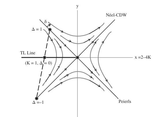 \[\begin{aligned} & \frac{d y}{d t}=x y, \\ & \frac{d x}{d t}=y^2 . \end{aligned} \tag{33}\] \[H_{\mathrm{c}} K=\int d x\left(\frac{1}{2}\left[K \Pi^2+\frac{1}{K}\left(\partial_x \phi\right)^2\right]+\frac{y}{2 \pi^2 \alpha^2} \cos \sqrt{16 \pi} \phi\right) \tag{5}\]参数$K=\frac{1}{\sqrt{4\Delta/\pi+1}}$,$y=K\Delta$.在RG图上,$K=1,\Delta=0$在$x<0 ,y=0$的直线上,该点的这个相是最原始的一维无相互作用体系,对应了Luttinger液体,这个相的规律满足第一次叙述玻色化的情况。对于TL液体,可以用一个参数描述的,图上的虚线就是TL液体的参数能处于TL相的范围。两条分界线对应了$y=-x$和$y=x$,求解方程$2-4\frac{1}{\sqrt{4\Delta/\pi+1}}=\Delta \frac{1}{\sqrt{4\Delta/\pi+1}}$,解为$\Delta =0.99$,对应另一支为吸引势$\Delta<0$的解理论存在,但是TL模型不适用没有解。总之,对于TL模型,在$\Delta<1$为$TL$相。y要想得到完整的RG流图要采用一般的sine-gordan模型,要求如果采用sine-gordan普适类的话,利用公式$5$,看作$K,y$是两个独立变量$K ,y=K\Delta$,则这条直线上对应$K>1/2 , \Delta=0$的相都属于Tomonaga-Luttinger 液体,如果这个相想要是TL相,需要计算Luttinger 参数$K$,至少要满足$K>1/2$。