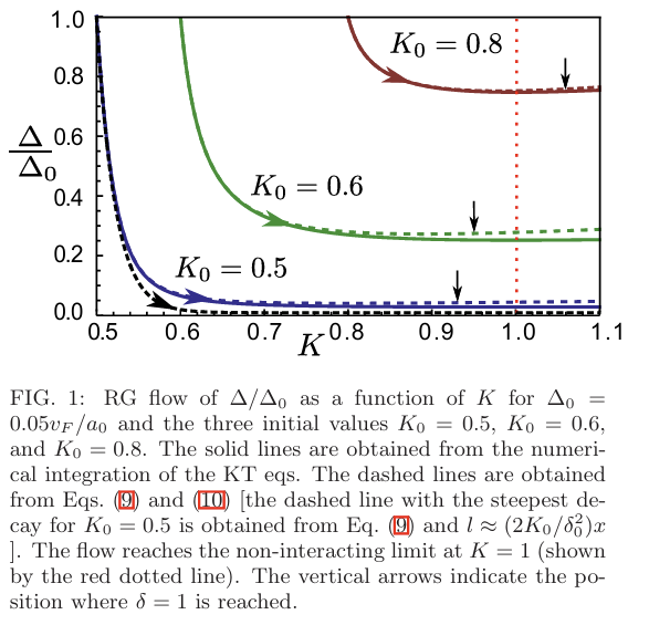 \[y^{\prime}=y\left[1+\left(2-\frac{\beta^2}{4 \pi}\right) d t\right]\]由于这是在$dt$小壳层上的积分,$y’\rightarrow y$,在Luttinger 液体中参数$\beta^2=16 \pi K$就得到了:
