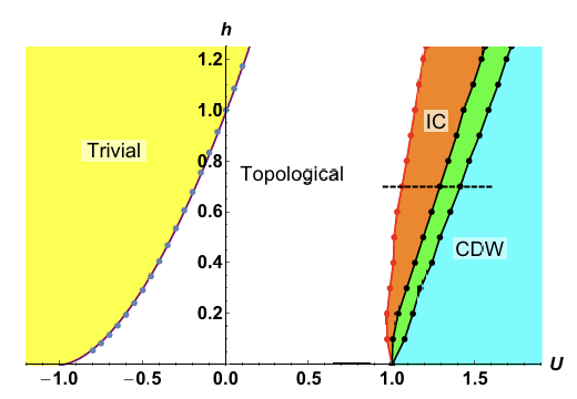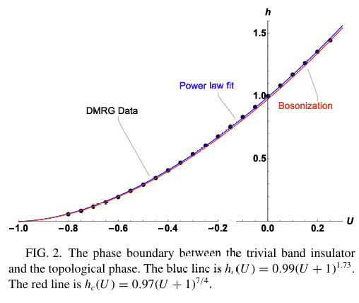 \[h \sim(U+1)^{7 / 4} \tag{86}\]用DMRG,可以通过拟合纠缠熵看到相变,拓扑相为Gapped,相变时关闭能隙,系统gapless。可以用CC公式拟合central-charge,理论上整条线上为Ising相变,$c=1/2$,除了在$x$轴上,为XY相变$c=1$,在整个ICDW相中,拟合central-charge是接近1的值,其余central-charge 都是零。