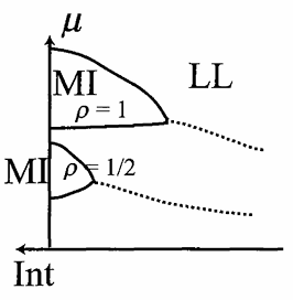 可以给一定的化学势,如果仍然在这个GAP中,系统是公度的。重要的是此时$K=1$对应于$K_c=1/2n^2$而LL-C相变点为$K_c=1/n^2$(这篇文献RG K定义小为CDW),可以说系统处于CDW中,因此可以以LE线的解作为“无相互作用”的情况,这是一个CDW相中的“无相互作用”,可以以此为基准做CDW相中的RG,微小偏离LE线只是会改变Gap的大小。