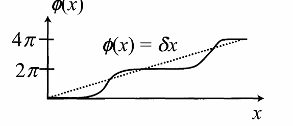 \[\rho(x)=\rho_0+\frac{\sqrt{2}}{\pi} \partial_x \phi_\rho+ \cos \left(2 k_F x+\sqrt{2} \phi_\rho\right) \tag{78}\]从上文哈密顿量极小化的两项可以看出,参杂项希望玻色场线性变化,而公度Umklapp希望玻色场是一个常数。从$63$式可以看到,公度的CDW,玻色场期望是常数,对应于密度是一个确定的周期。现在加入参杂,许多参杂玻色场会连续,现在如果只有一个空穴子激发,即一个参杂。从holon的角度是$101010……$变为了$1010110101……$,CDW序反号,系统中出现筹壁。从soliton的角度原本是一个平台的玻色场变为了两个平台在$x_c >x$时不变,仍为$1010……$,而在$x>x_c$区域密度给出$\rho(x)=\rho_0+\frac{\sqrt{2}}{\pi} \partial_x (\phi_\rho+C) +\cos \left(2 k_F x+\sqrt{2} \phi_\rho+C\right)$,第二项仍然是零,第三项常数的引入跳跃了一个周期,电子密度为$0101……$。标量场$ \lim _{x \rightarrow-\infty} \phi(x)=\phi_1, \quad \lim _{x \rightarrow+\infty} \phi(x)=\phi_2$,称中间产生了一个扭结(Kink)(静态拓扑缺陷),定义为: