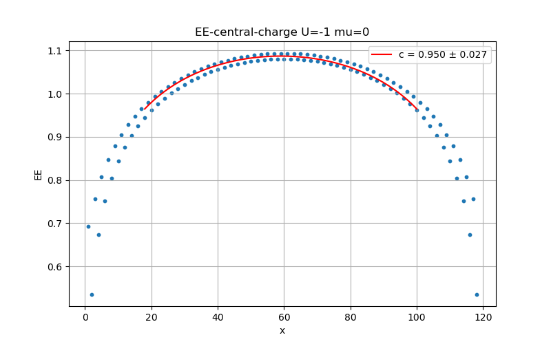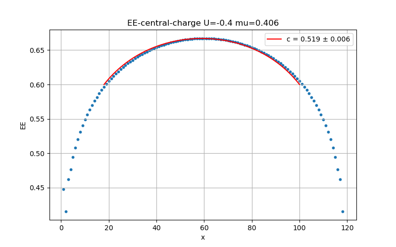 这个哈密顿量就描述了两类相变LL-Mott和C-IC相变。LL-Mott相变第一次就推导过了,这里有一个关键点:Gap从能带色散看出:$E_{\bar{u}, \bar{l}}= \pm \sqrt{(u k)^2+\Delta^2}$,是否有这样一个结论,相互作用足够大的时候,Gap足够大可以跨越两个公度相之间的非公度部分,使得非公度相消失,是否只要是足够大的$U$,一定能看到ICDW-CDW的相变?在我的结果中$U$较小的ICDW相大的周期,$U$大的ICDW周期为2,有CDW的周期,但是纠缠熵仍然呈现ICDW的gapless结论,并非CDW。